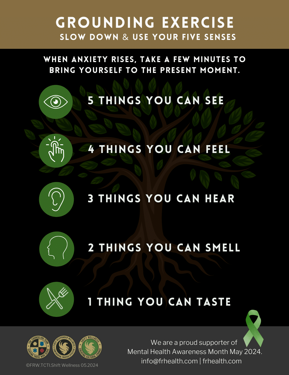 Grounding is no substitute for therapy. If you struggle with an anxiety disorder, you may need to work with a professional therapist and you may need medication. First Responder Wellness uses trauma-informed strategies to address the unique needs of law enforcement, firefighters, paramedics, and other first responders with post-traumatic stress injury, substance use disorders, anxiety and depression.