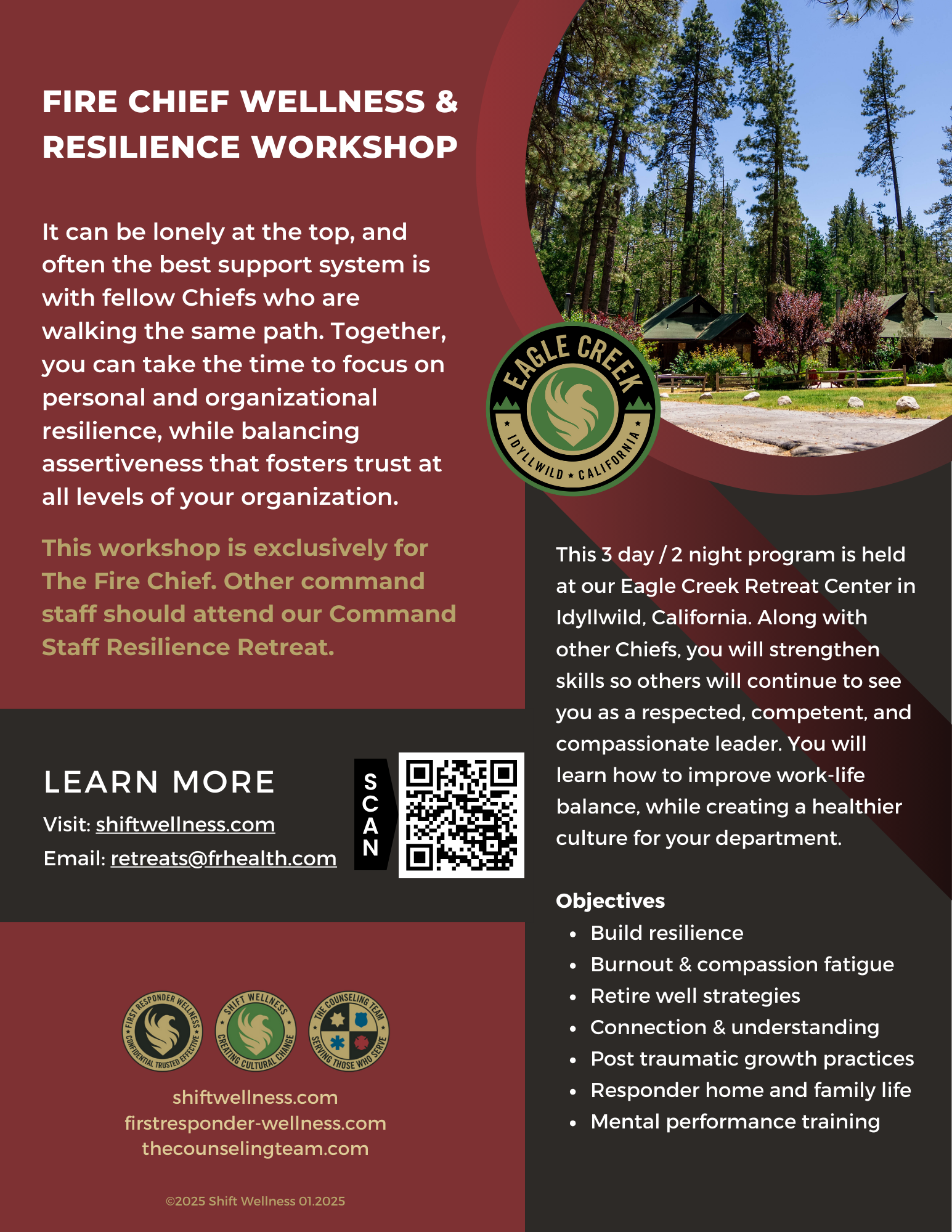 This workshop is exclusively for the Fire Chief. Other command staff should attend our Command Staff Resilience Retreat.